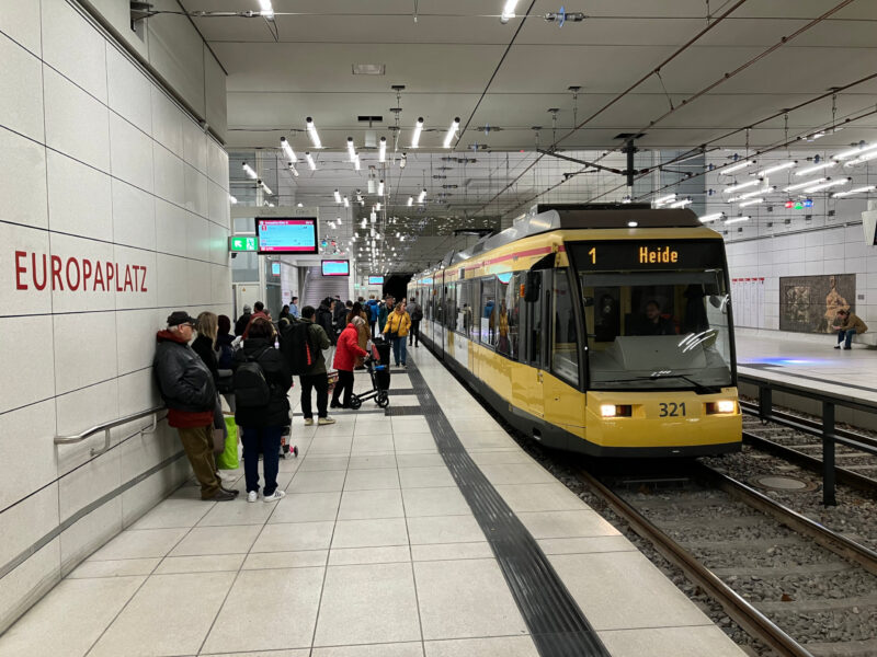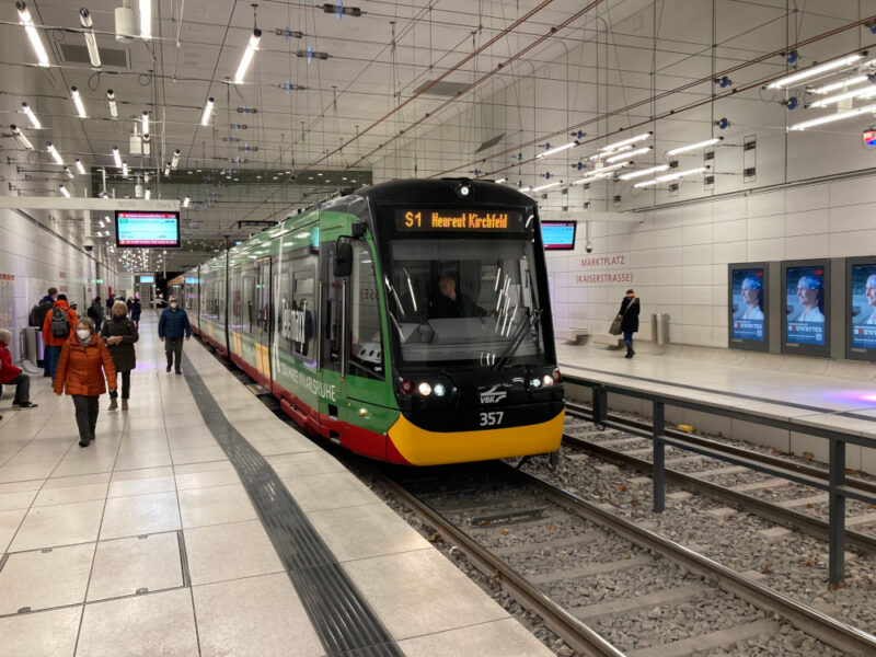 La création du tunnel n’a fait gagner en moyenne que 2 min 30 sur l’axe est-ouest. C’est peu, compte tenu du maintien du même nombre de stations, d’un triangle sous Marktplatz parcouru à la même vitesse qu’auparavant en surface et d’une exploitation au signal qui allonge régulièrement les arrêts.