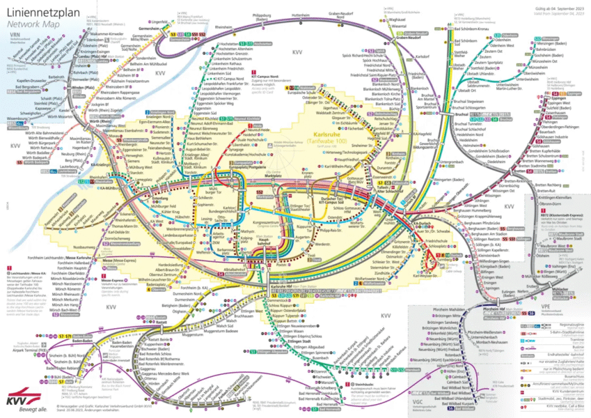 La double aptitude du tram-train lui permet aussi de sortir du réseau et de desservir plus finement les villes, comme à Wörth, Heilbronn et Bad Wildbad, dans une logique amenant le tramway au plus près des habitants. Le développement du tram-train a aussi conforté un modèle spatial comprenant plusieurs pôles urbains complémentaires. La géographie des déplacements n’est pas uniquement orientée vers Karlsruhe : citons Baden-Baden, Rastatt, Achern, Pforzheim, Bruchsal…