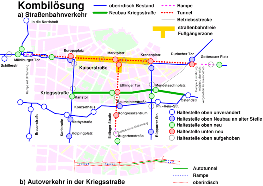 Le premier projet de tunnel avait été étudié en 1996 mais prévoyait le maintien des lignes urbaines en surface. Il était complété par une nouvelle liaison sur Kriegsstrasse, parallèle à Kaiserstrasse. D’un coût de 530 M€, il aurait été financé à 60% par l’Etat et 25 % par le Land. Seuls 15 % auraient été à la charge de Karlsruhe.