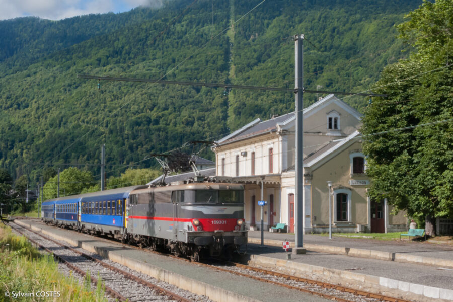 Bagnères-de-Luchon – 2 juillet 2012 – La tâche confiée à la BB9301 n’est pas trop difficile, la tranche Luchon du train de nuit ne comprenant que 3 voitures. (Cliché S. Costes)