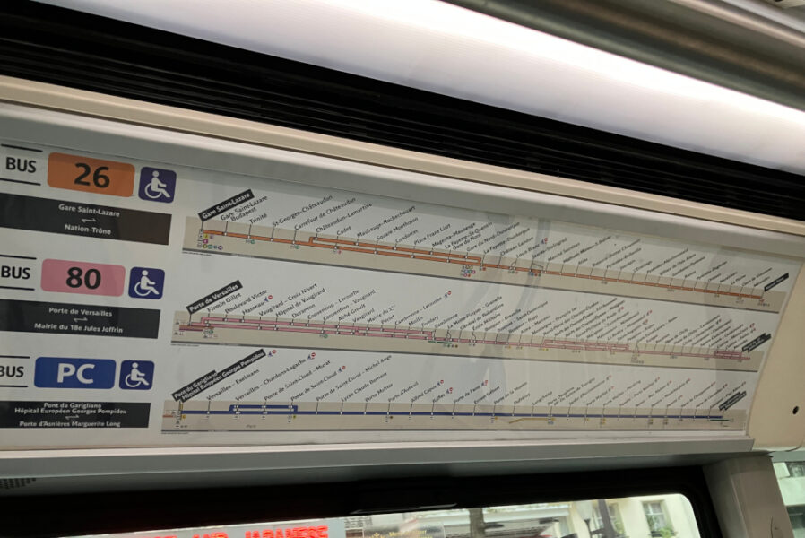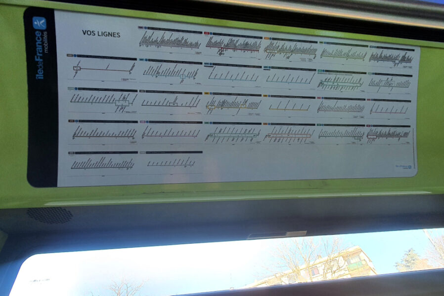 A bord des autobus, l’information est surtout portée par des supports sur les voussoirs. De plus en plus, pour éviter d’avoir à changer les plans quand un véhicule passe d’une ligne à l’autre, on voit fleurir des situations avec plusieurs lignes sur un même support quitte à rendre les plans illisibles. Record constaté : 25 lignes sur une même feuille. Contractuellement, le plan est affiché, mais il est totalement inutilisable par le voyageur. Les opérateurs pratiquant de la sorte devraient être sanctionnés pour se moquer ainsi du public… mais l’autorité organisatrice devrait aussi clarifier ses exigences, à commencer par n’installer dans le véhicule que le plan de la ligne sur laquelle il circule. Il n’y aurait d’ailleurs aucune honte à retenir et étendre ce qui était bien fait : les plans intérieurs conçus par la RATP, très bien détaillés, fruit d’une longue expérience, pourraient servir de standard à l’ensemble de l’Ile-de-France.