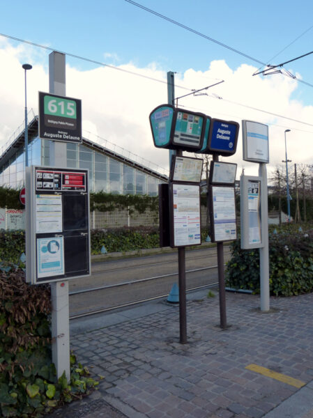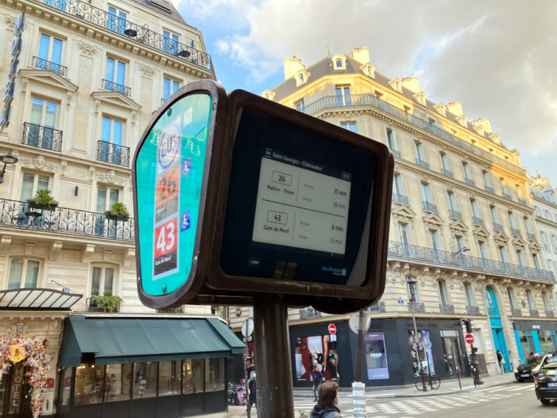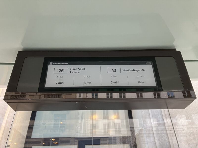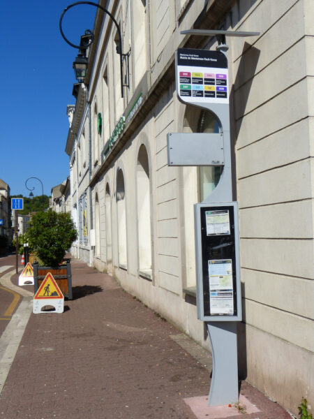 Le potelet parisien, la « tête de vache », reste en place sur le périmètre historique de la RATP mais ses côtés changent à nouveau de couleur (bleu IDFM évidemment après le vert jade RATP ayant lui-même succédé au rouge et jaune adopté vers 1955, d’ailleurs très visible dans le paysage urbain à l’époque). Le support reste de taille limitée et conduit à des solutions sur mesures. Les anciens écrans SIEL (Système d’Information En Ligne) à cristaux liquides, installés à partir de 1994 sont devenus obsolètes et les modèles installés ces dernières années n’ont pas donné satisfaction : l’écran TFT en couleurs, déclinaison des écrans Image des réseaux ferrés, a été jugé trop énergivore. Le nouvel écran, façon liseuse électronique, est plus économe et fonctionne sur batteries. C’est d’ailleurs un des gros défauts de la charte unifiée d’information et de signalétique aux arrêts, qu’on retrouve également dans les couloirs du métro et du RER : pour résumer, c’est écrit avec une police trop maigre et surtout trop petite !