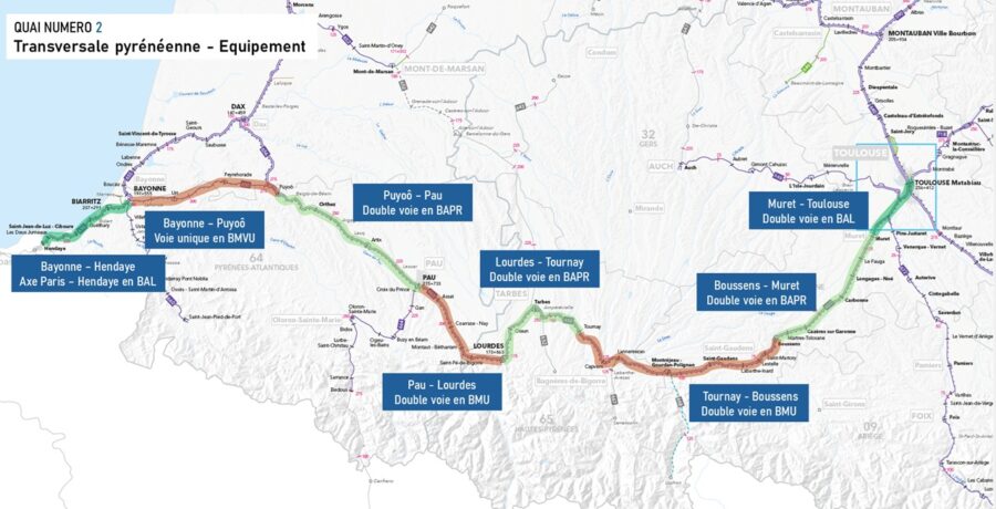 En 2026, La transversale pyrénéenne accueille 4 allers-retours TET Toulouse – Bayonne dont un prolongé à Hendaye. Bayonne est ainsi à 3h25 de Toulouse, soit 30 minutes de plus qu’en voiture. Cette liaison a bien failli disparaître : c’était une incongruité du rapport Duron en 2015, proposant la conversion à l’autocar. Maintenue, la ligne a été dotée de 9 automotrices Coradia Liner, d’une capacité cependant limitée à 173 places. C’est moitié moins que les compositions de 4 voitures Corail qu’elles ont remplacées. Quant au train de nuit Paris – Tarbes, il a été supprimé à l’été 2017, mais a été rétabli en décembre 2021.