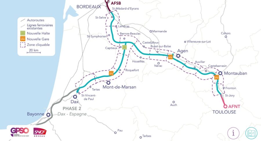 Le projet de ligne nouvelle Bordeaux – Toulouse / Dax comprend un tronc commun de Saint-Médard-d’Eyrans jusqu’aux environs de Captieux où se séparent les branches vers Dax et Castenau-d’Estrétefonds, à l’entrée nord de Toulouse. De part et d’autres, la ligne classique est réaménagée avec mise à 3 voies entre Bordeaux et Saint-Médard-d’Eyrans et à 4 voies de Saint-Jory à Toulouse.